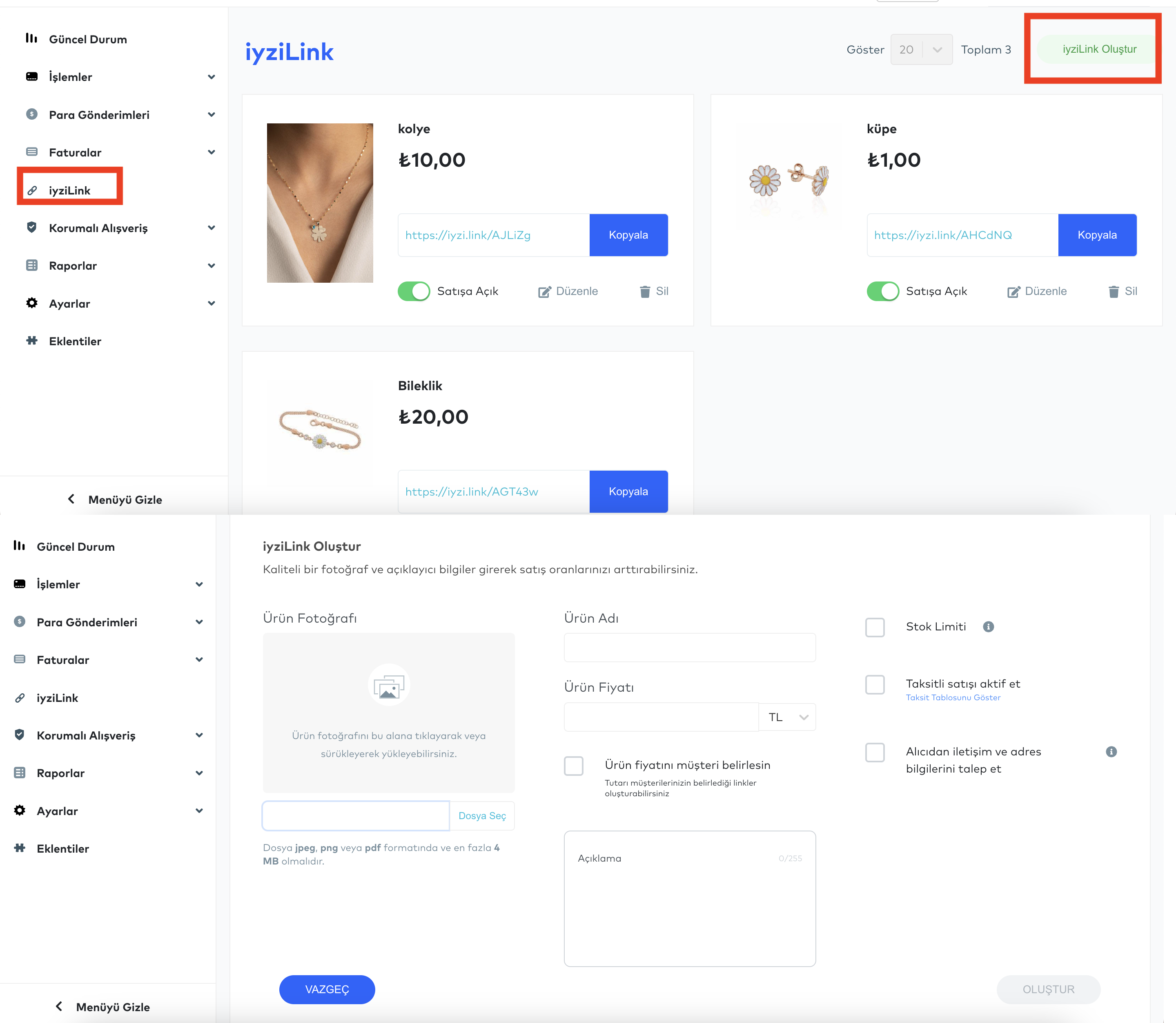 İlgili alanda sağ üste köşede bulunan "iyzico Link Oluştur" alanına tıklandığında link oluşturma ekranı açılmaktadır. Açılan ekranda ürüne ait fotoğraf (jpeg, png veya pdf formatında ve en fazla 4 MB olmalıdır.), ürün adı, ürün fiyatı, ürüne ait açıklama girilerek link oluşturulabilmektedir. Bunlara ek olarak, üyelikte taksit seçenekleri aktifse, linkte tercihe bağlı olarak sağ alanda bulunan "Taksitli satışı aktif et" butonundan link taksit ödemelerine açık hale getirilebilir ve "Stok Limiti" butonundan linke stok atanabilir. Stok sayısı kadar ödeme geçtiğinde link ödeme alımına kapanacaktır.