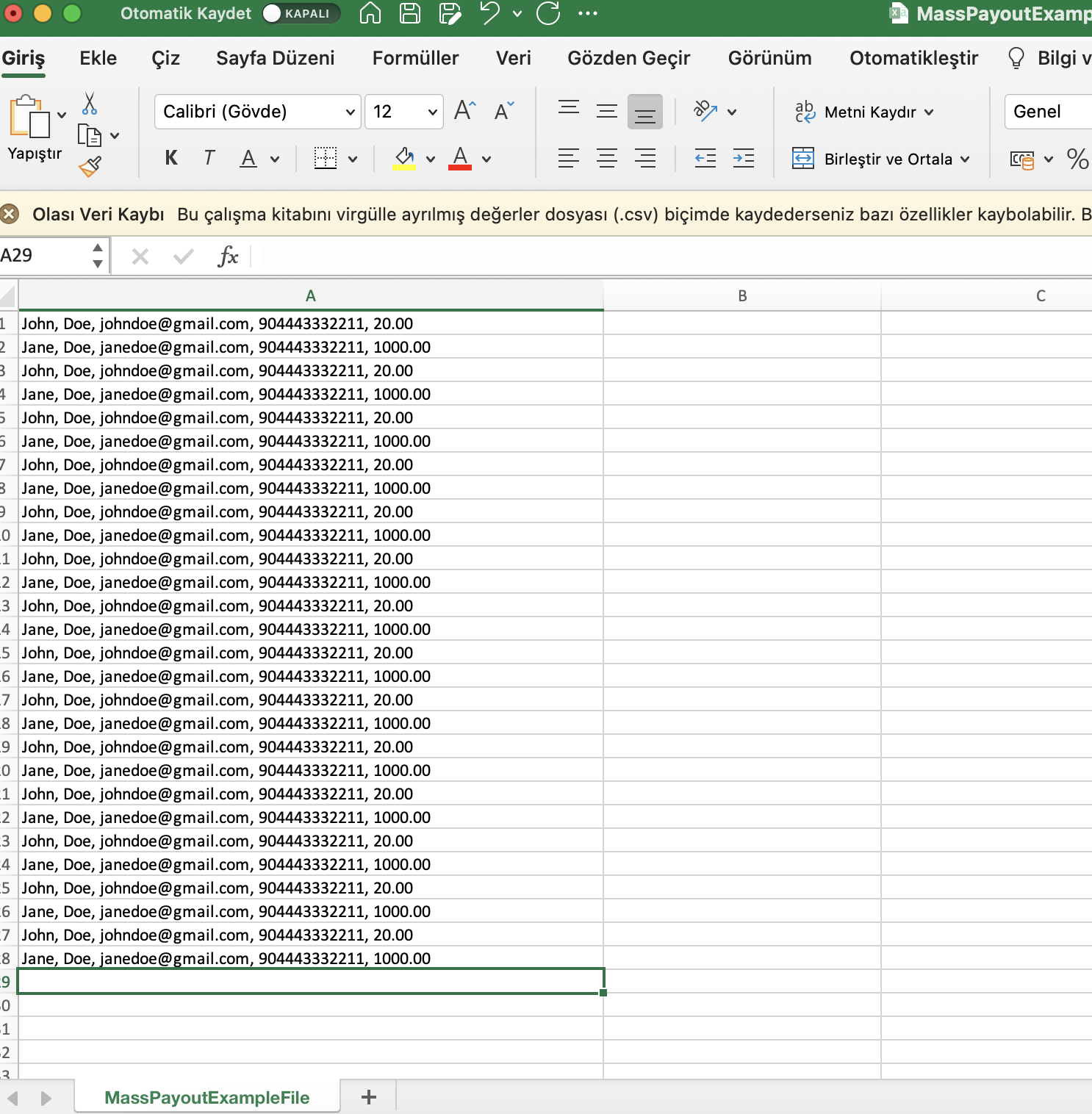 *CSV dosyası oluşturulurken telefon ve gönderilecek tutar değerlerine dikkat edilmelidir. Örnek telefon formatı: 904443332211 Örnek tutar formatı: 1000.00 şeklinde olmalıdır.