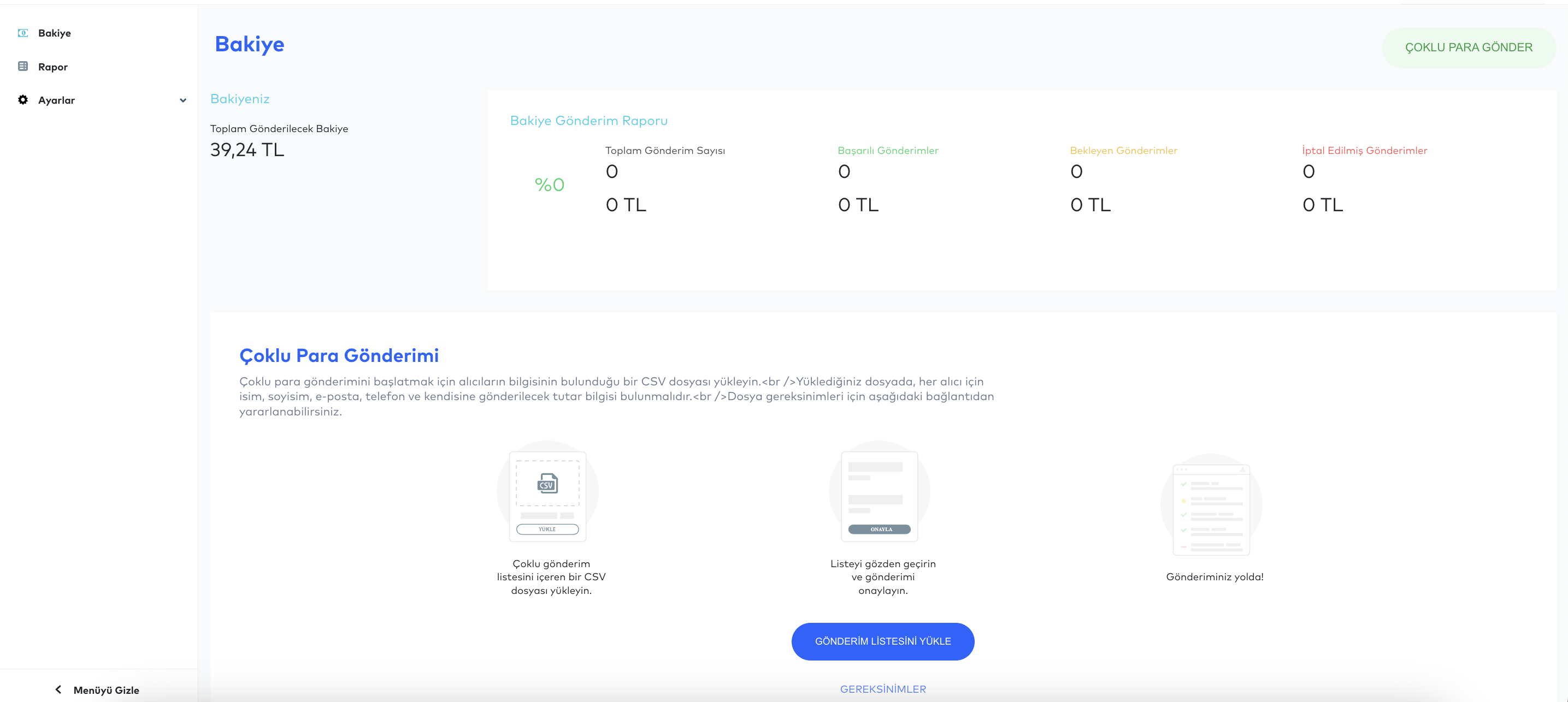 Çoklu para gönderimi, üye işyerlerimizin birden fazla alıcıya para gönderimini mümkün kılan iyzico servisidir. iyzico merchant panelinde tek bir csv doyası yüklenerek dakikalar içinde para gönderimine olanak sağlar. Servisi kullanabilmek için alıcı bilgilerinin (isim, soyisim, telefon, email) ve gönderilecek miktarın csv dosyası olarak iyzico platformuna yüklenmesi yeterlidir. iyzico platformu her satırı (ödemeyi) saniyeler içinde işleyerek para gönderimleri hakkında detaylı bir rapor sunmaktadır.