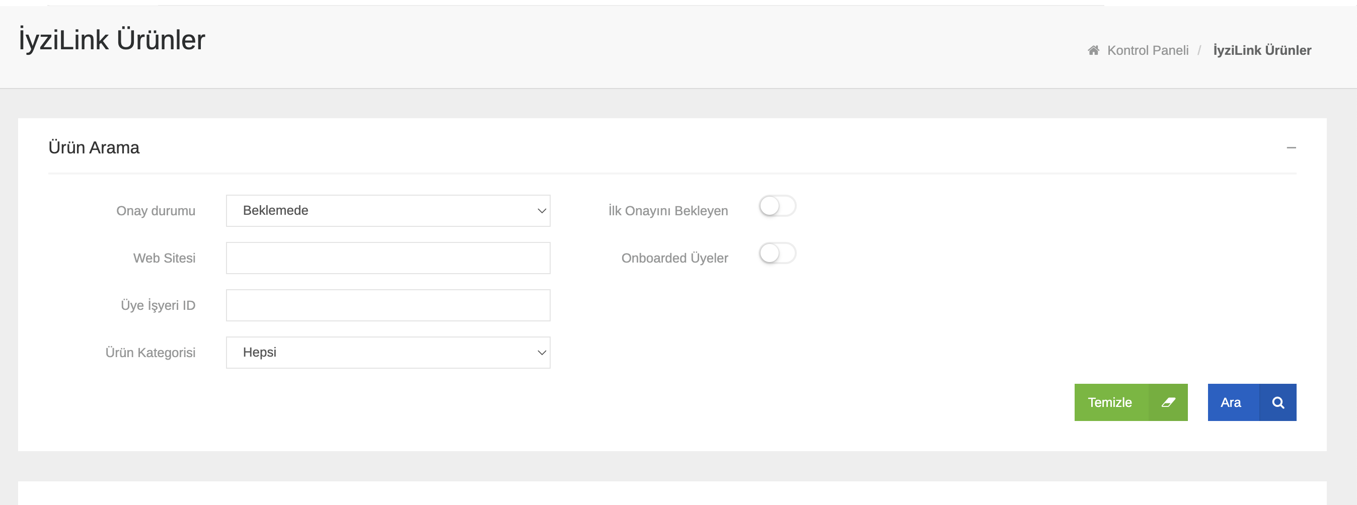 Bu alan üzerinden, bir üye işyerine ait bütün linkler görüntülenebilmektedir. İlgili alanda bulunan filtreleme alanına üye işyeri ID yazılarak ilgili üye işyerinin linklerine ulaşılabilmektedir. Sayfada bulunan "Onay Durumu" alanında onay alan ilk linkler "Onaylandı" alanında, bir üye işyerinin oluşturduğu bütün linkler "Beklemede" alanında görüntülenmektedir.