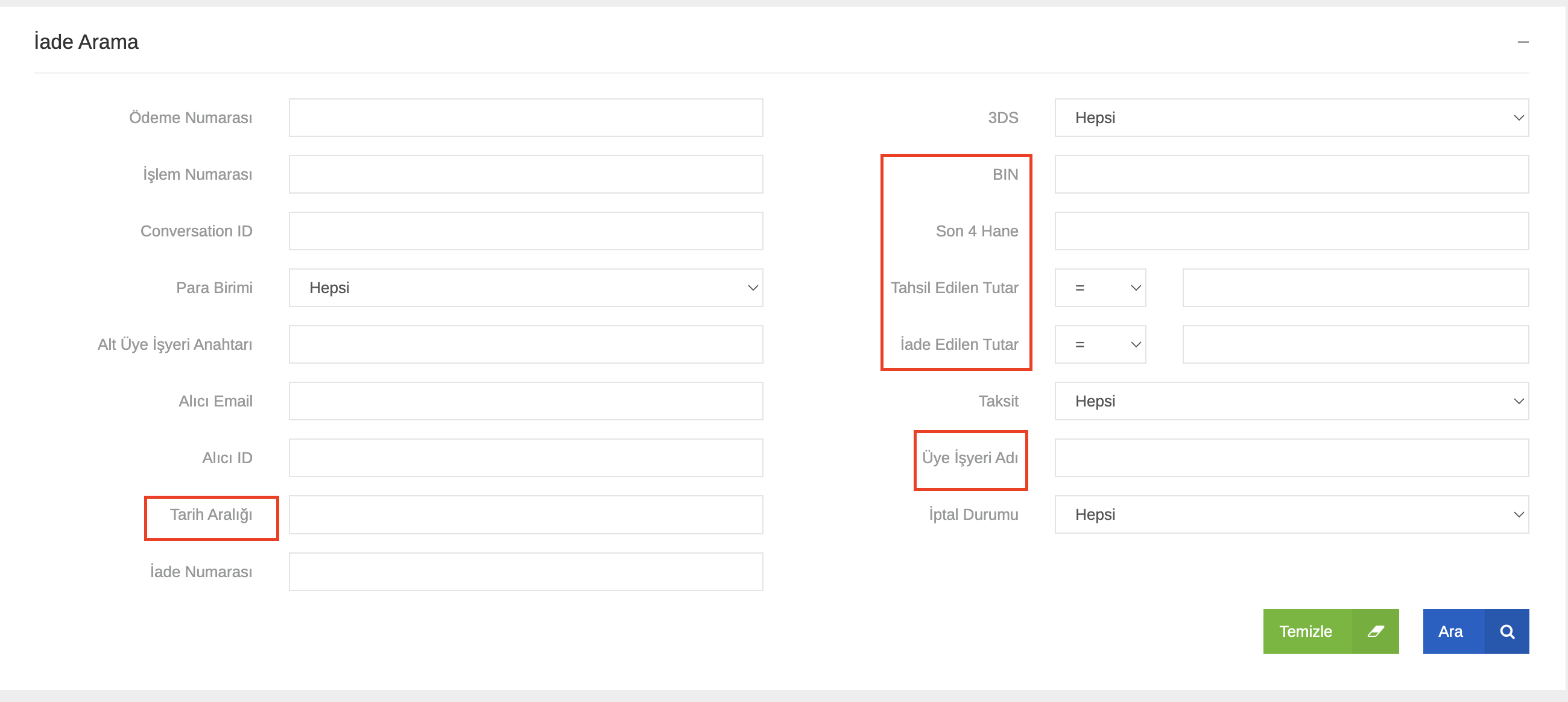 Bir üye işyerinin iadelerine ulaşmak için, sayfada sağ üstte bulunan "+" işaretine basılmalıdır. Daha sonrasında açılan filtreleme alanında bulunan Üye İşyeri Adı alanına üye işyerinin bizde kayıtlı adı yazılmalıdır. Genel olarak ya da belirli tarih aralığındaki iadelerinin kontrol edilmesi gerekiyorsa, istenilen tarih aralığı seçilmelidir. Eğer belirli bir ödemenin iadesine ulaşılmak isteniyorsa BIN, son 4 hane ya da ödeme ve iade tutarı gibi bilgiler de eklenebilir.
