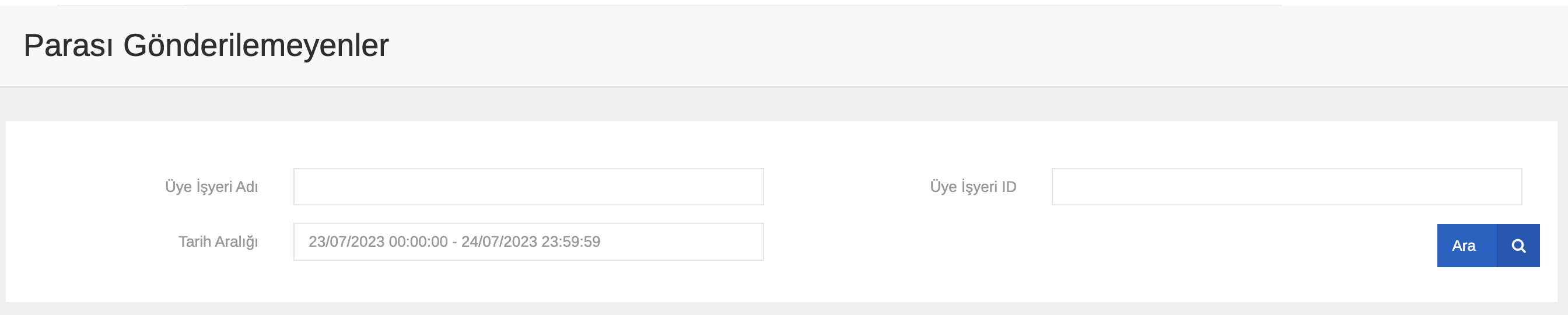 Üye işyeri Gönderilemeyenler Listesi alanında üye işyeri ID ya da adı yazarak ve istenilen tarih aralığı seçilerek bu tarihte hata almış para gönderimlerini görüntüleyebilmekteyiz. Hata alan para gönderimi daha sonra güncellemelerle başarılı bir şekilde tamamlanınca bu alanda görüntülenmemektedir.