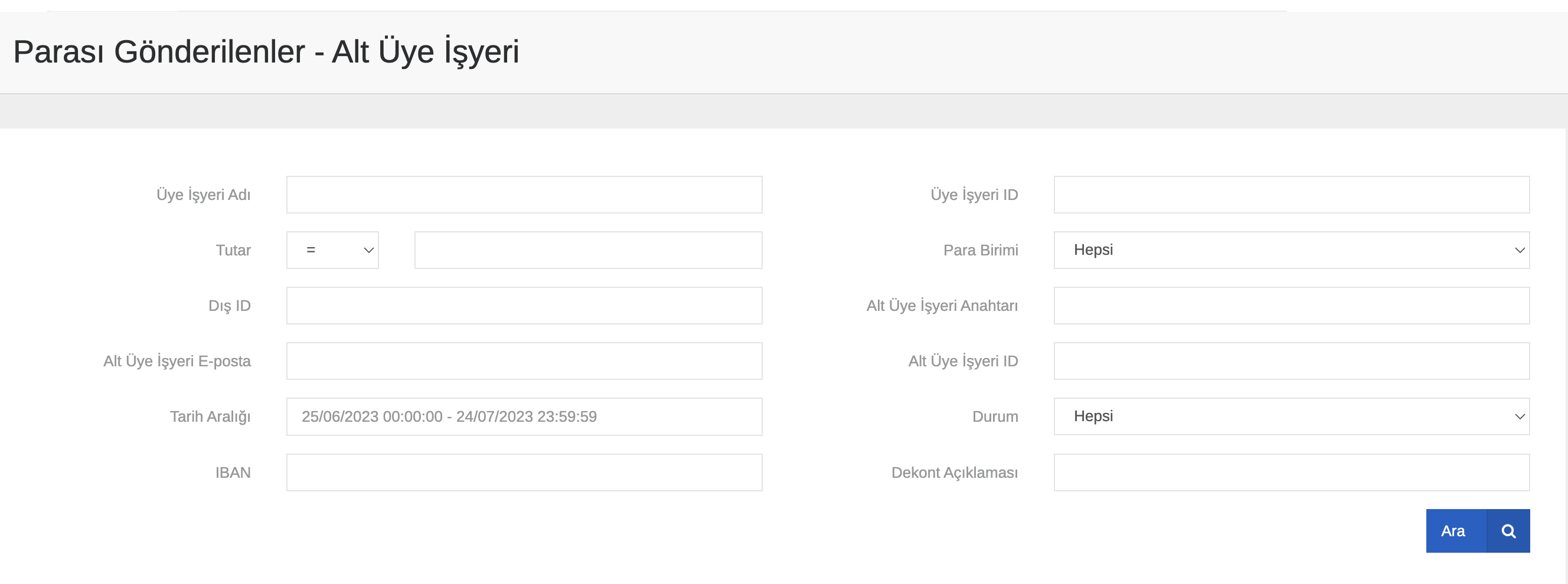 Alt üye işyeri Gönderilenler Listesi alanında üye işyeri ID, yazılarak üye işyerinde kayıtlı alt üye işyerlerinin gönderimlerine ulaşılabilmektedir. Alt üye işyeri e-posta, alt üye işyeri ID ya da anahtarı gibi bilgiler girilerek de belirli bir alt üye işyerinin gönderimleri kontrol edilebilmektedir.