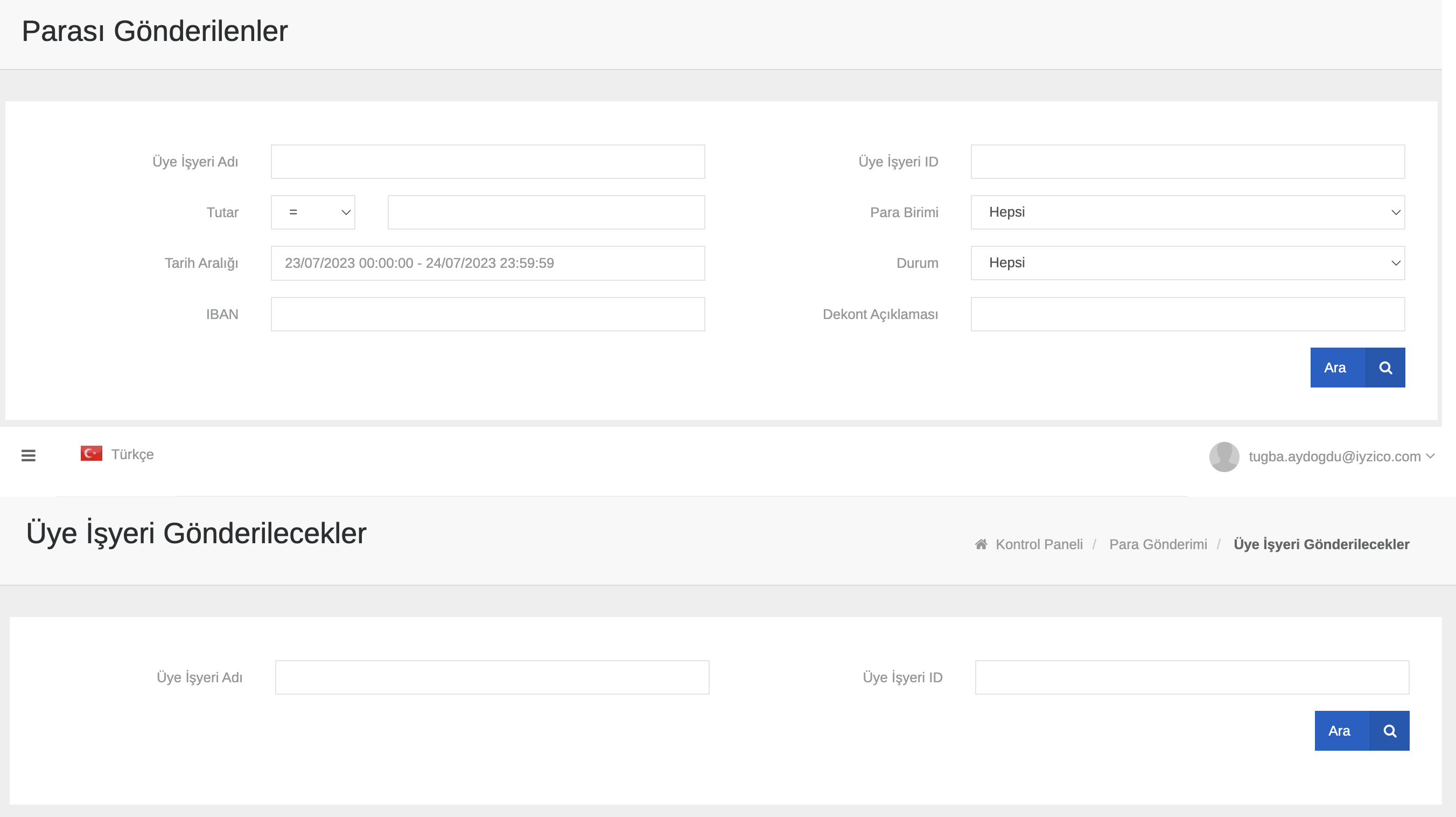 Üye işyeri Gönderilenler Listesi alanında üye işyeri ID ya da adı yazarak, üye işyerine yapılan para gönderim tarihlerini, o tarihte gönderilen tutarı, varsa o tarihli para gönderimine ait tutardan yapılan iade tutarını ve iade yapmak için yüklenen ek bakiye tutarını görebilmekteyiz. Gerekli olması durumunda tarih, para birimi gibi ek filtrelemeler de kullanılabilir. Gönderimin en sağında bulunan "+" sembolüne tıklayarak, para gönderimi hangi tarihli ödemelere ait detaylı şekilde görüntüleyebilmekteyiz.