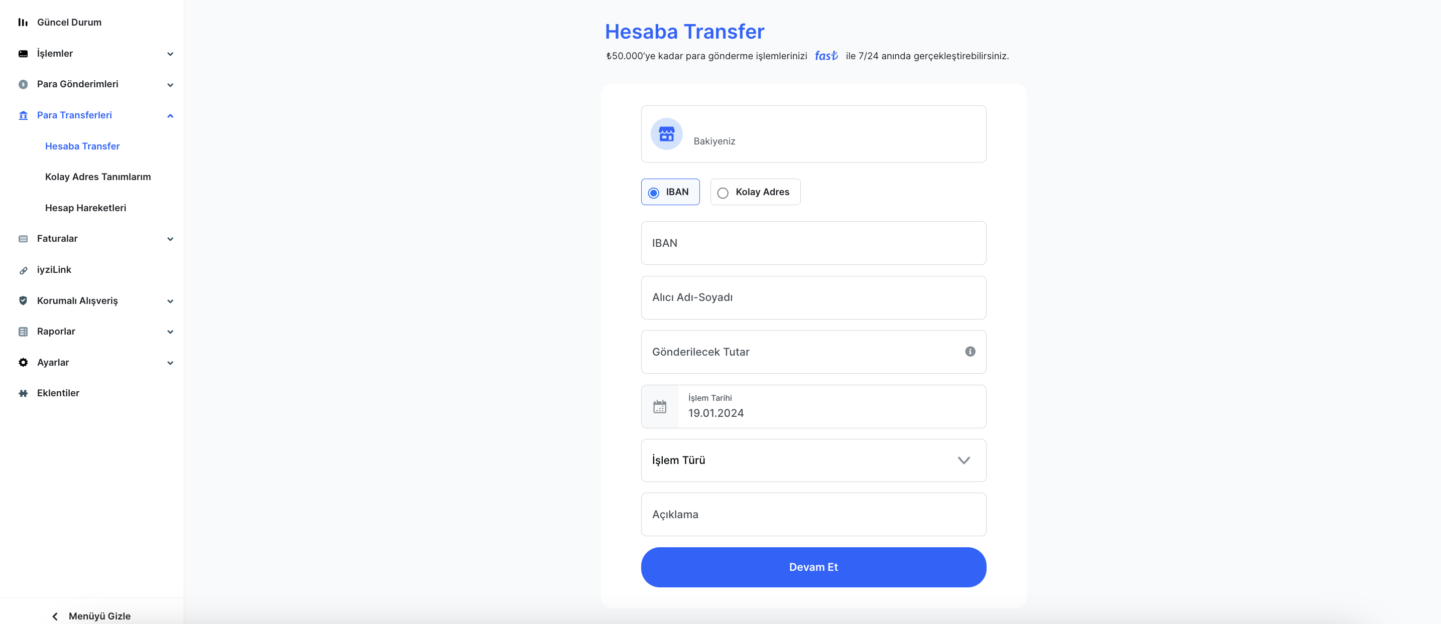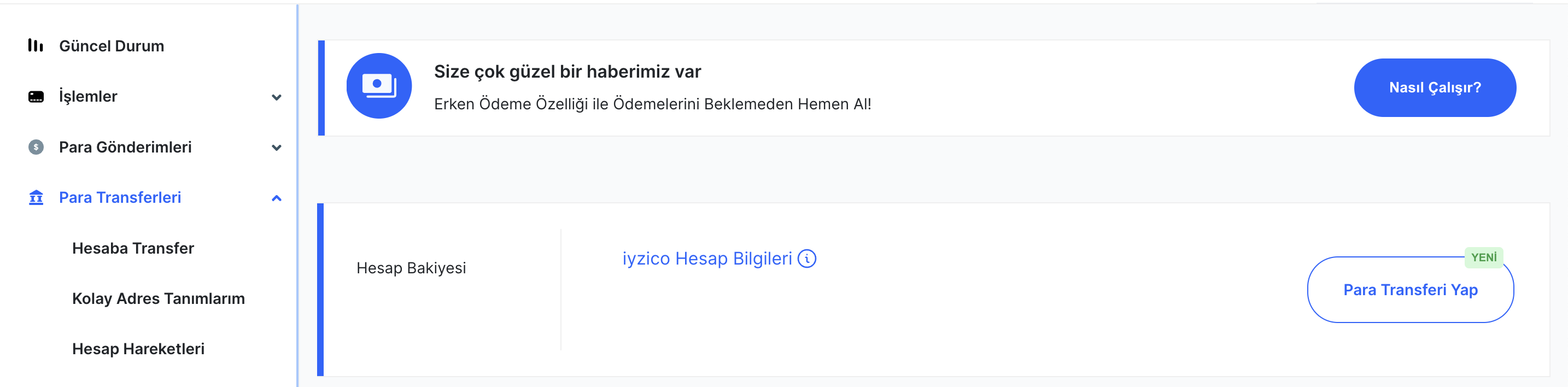 Tutarlar iyzico hesabına aktarıldıktan sonra, iyzico paneli üzerinde bulunan “Güncel Durum” alanı üzerinden hesap bilgileri ve bakiye görüntülenebilmektedir. Daha sonrasında yine bu alanda bulunan “Para Transferi Yap” butonu üzerinden ya da panelde sol tarafta bulunan “Para Transferleri-Hesaba Transfer” adımları üzerinden herhangi bir hesaba bu bakiye üzerinden FAST/EFT ya da Havale olarak para transferi gerçekleştirilebilmektedir.