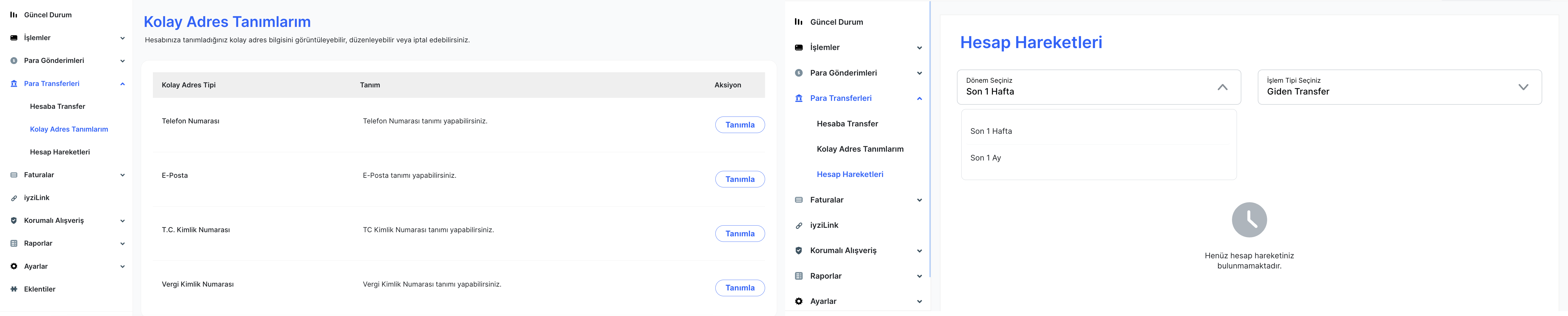 Hesap Hareketleri alanından son 1 hafta ya da son 1 ay içerisinde FAST üzerinden yapılan işlemler görüntülenebilmektedir.