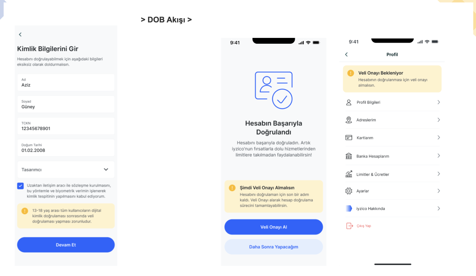 Bu Member’lar için de normal DOB akışı geçerlidir. Ancak buna ek olarak, ilk aşamada kimlik bilgilerini girdiğinde sistem yaşını algılayarak kendisine «Veli Onayı» hatırlatması yapılmaktadır. Daha sonrasında DOB akışı tamamlanabilir. Doğrulama tamamlandıktan sonra Member’a «Veli Onayı Al» seçeneği çıkar. Veli onayı süreci de tamamlandıktan sonra doğrulama akışı tamamlanır.
