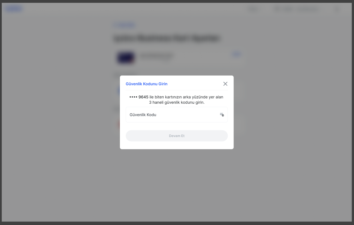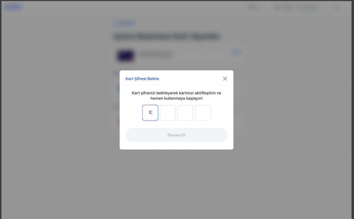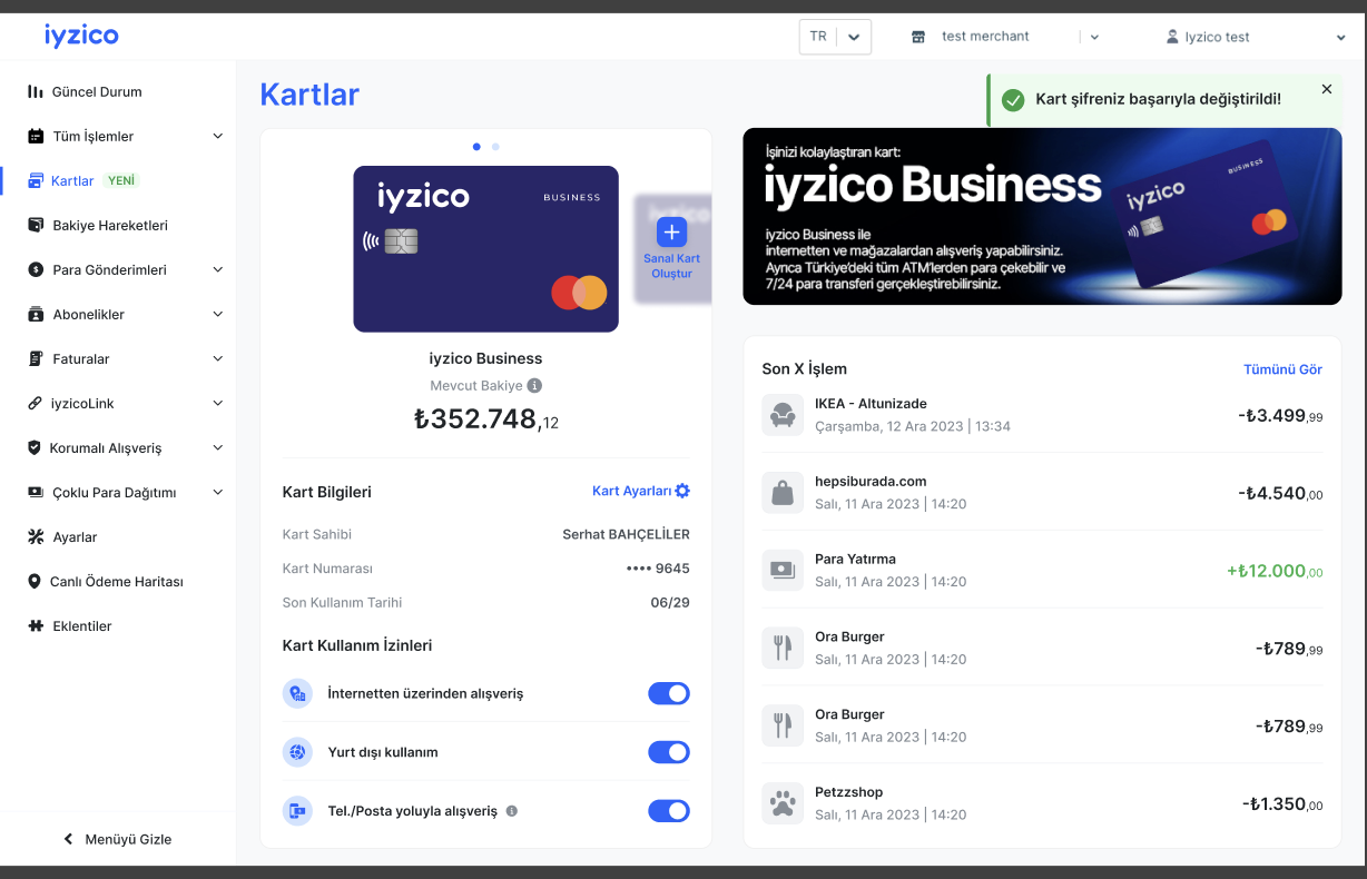 Kart şifresi değiştirilmek isteniyorsa, panelde bulunan “Kartlar-Kart Ayarları-Kart Şifreni Değiştir” adımları üzerinden yeni bir şifre belirlenebilmektedir.