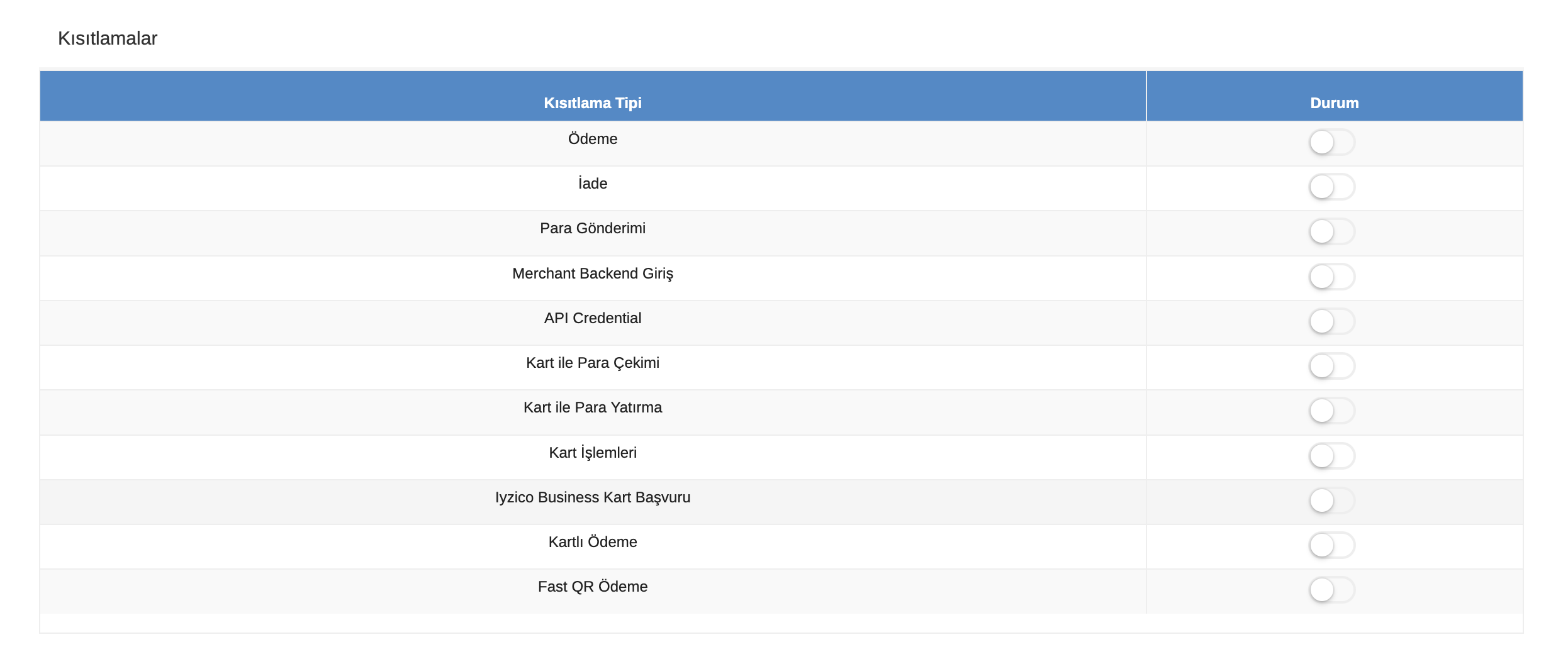 Kart kısıtlamalarıyla alakalı olarak üye işyerine ait admin sayfasındaki “Kısıtlamalar” sekmesine 5 yeni fonksiyon eklenmiştir:
