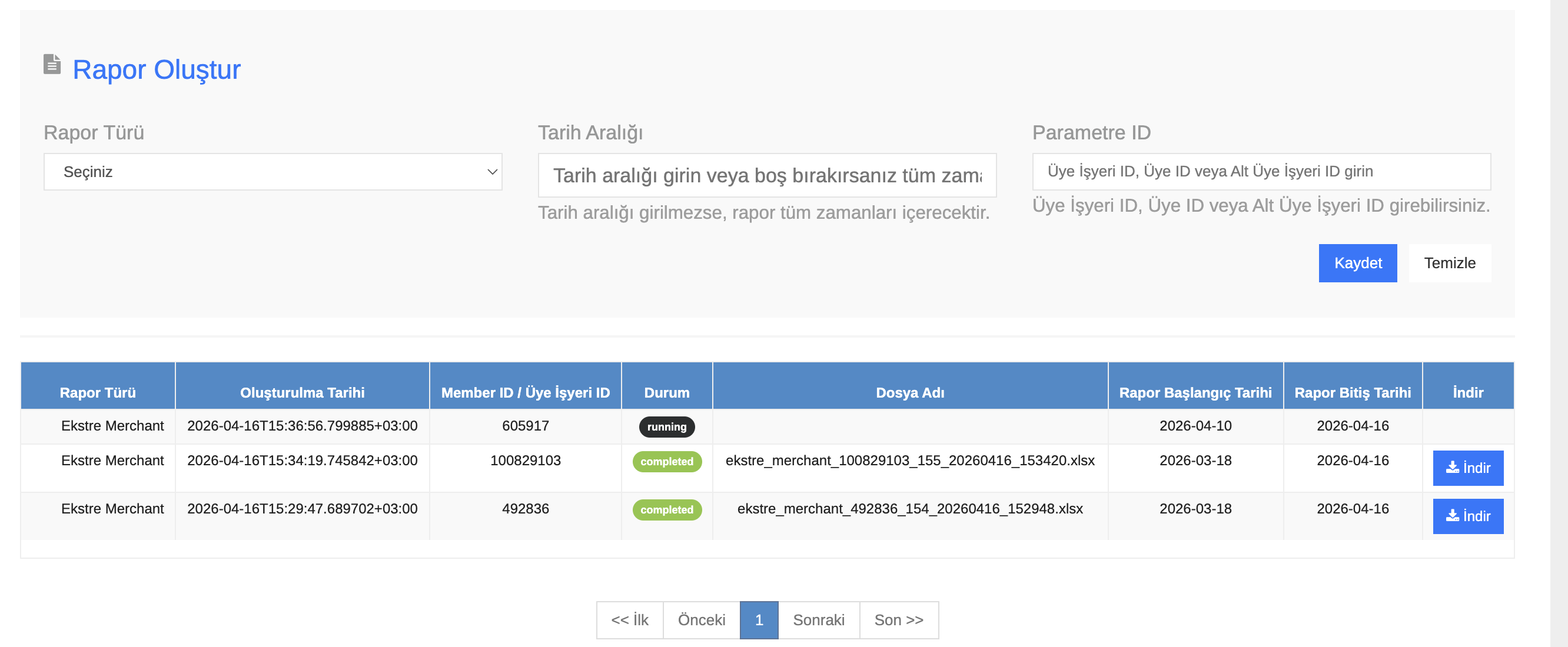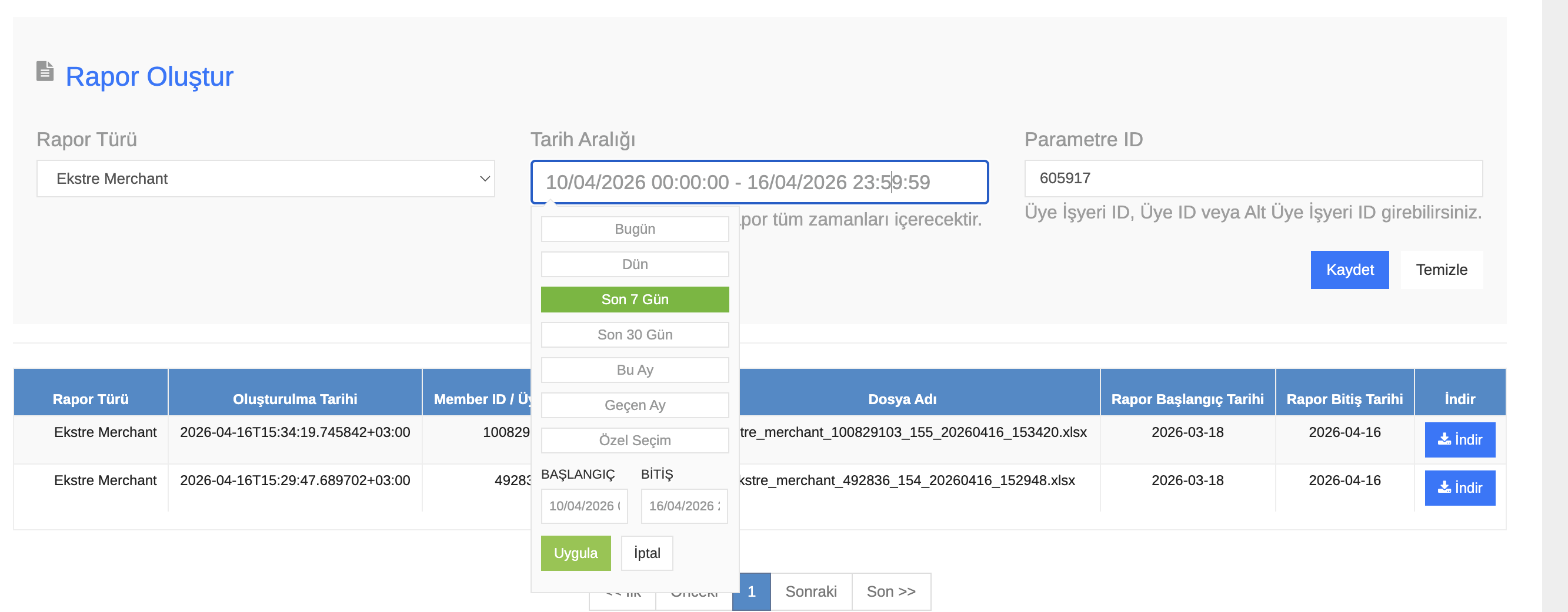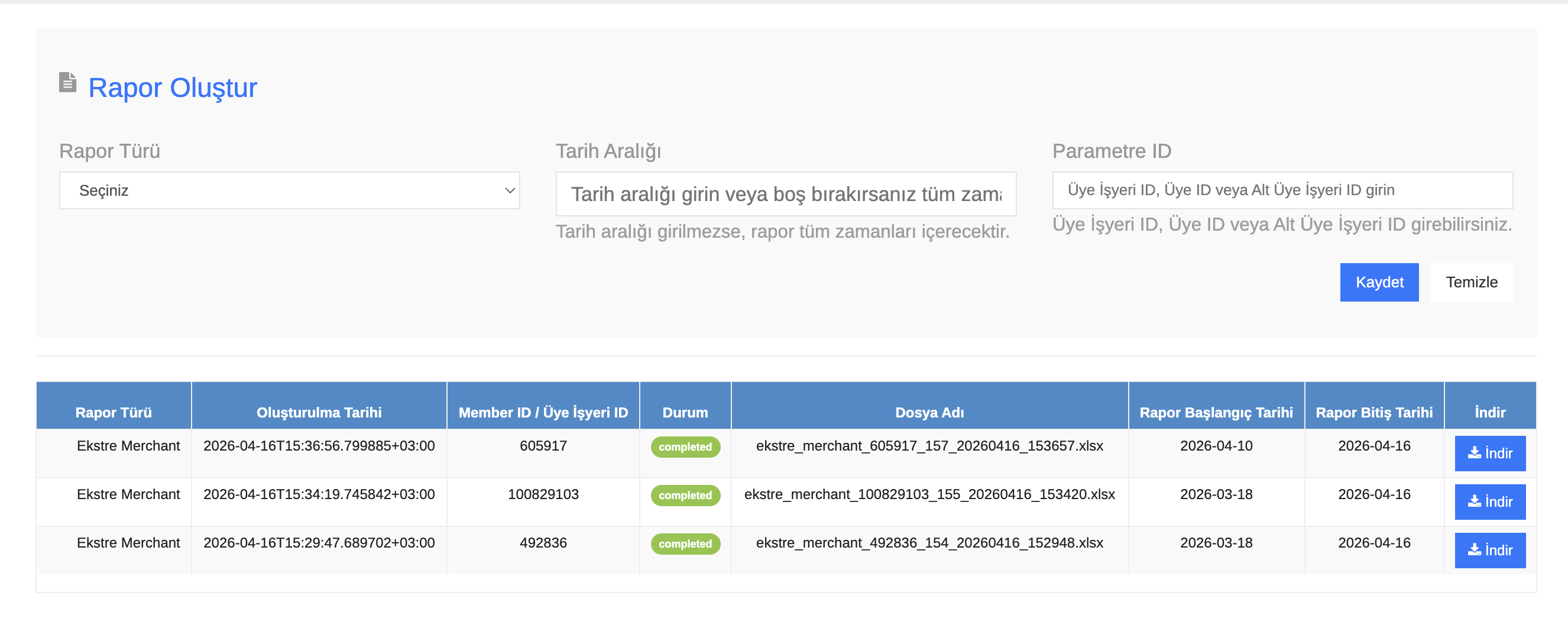Admin panel üzerinde bulunan "Rapor Talepleri" alanı üzerinden rapor türü, tarih aralığı ve üyelik ID bilgileri girilerek "Kaydet" tuşuna basılır ve rapor açma talebi oluşturulur. Rapor oluştuktan sonra sayfada oluşan "İndir" butonu üzerinden rapor indirilebilir.